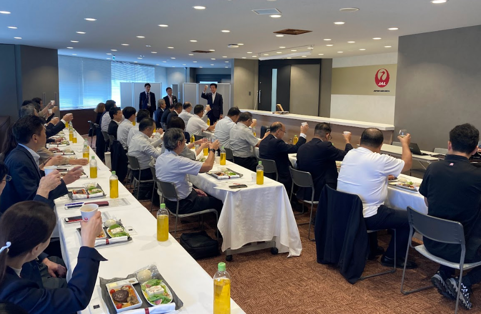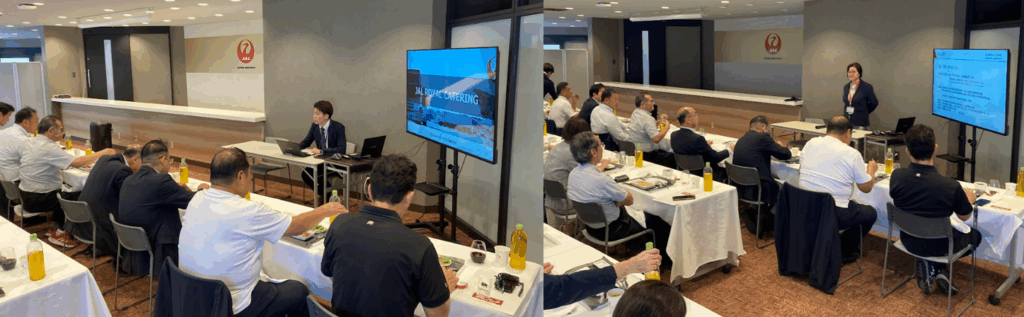 羽田空港の隣にございます機内食工場にて、実際の機内食を召し上がりながら、こだわりや品質管理に関しての講演会を実施いたしました。地上とは異なる環境で提供される機内食には、味はもちろんですが徹底した衛生管理が施されているということを理解することができ、宿泊施設の皆さまはもちろん運輸観光施設の皆さまも熱心にお話を聞いておられました。