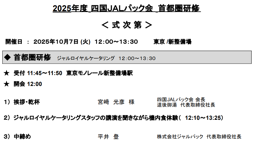 2025年10月7日(火)四国JALパック会 首都圏研修を実施いたしました。 今年度はJALの機内食を担う会社、ジャルロイヤルケータリングで実施いたしましたので詳細をご報告させていただきます。